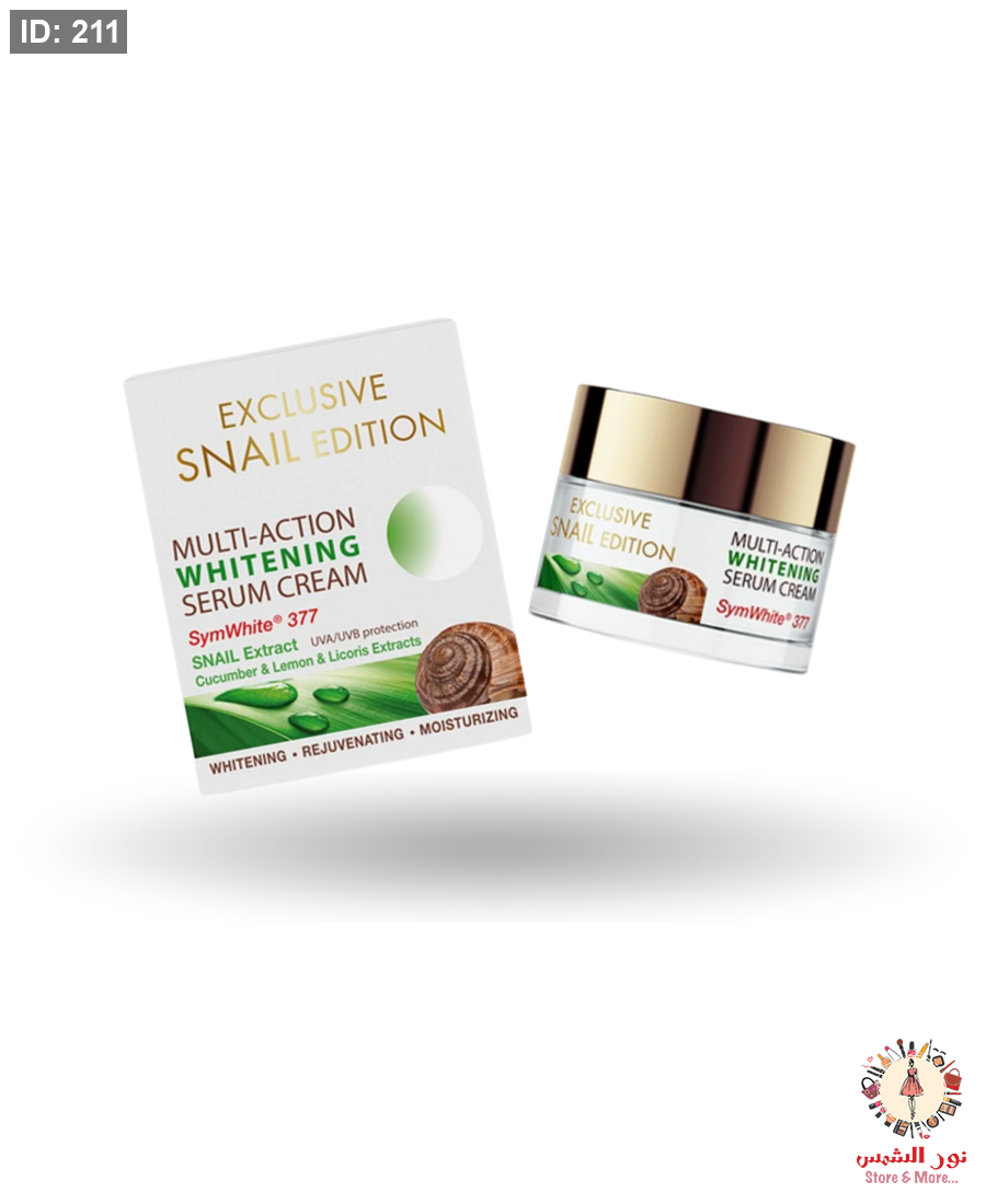 دلّلي بشرتك بعناية فاخرة مع Exclusive Snail Edition Whitening Serum Cream الغني بخلاصة الحلزون الطبيعية المعروفة بقدرتها على تجديد خلايا البشرة وتحفيز الكولاجين.