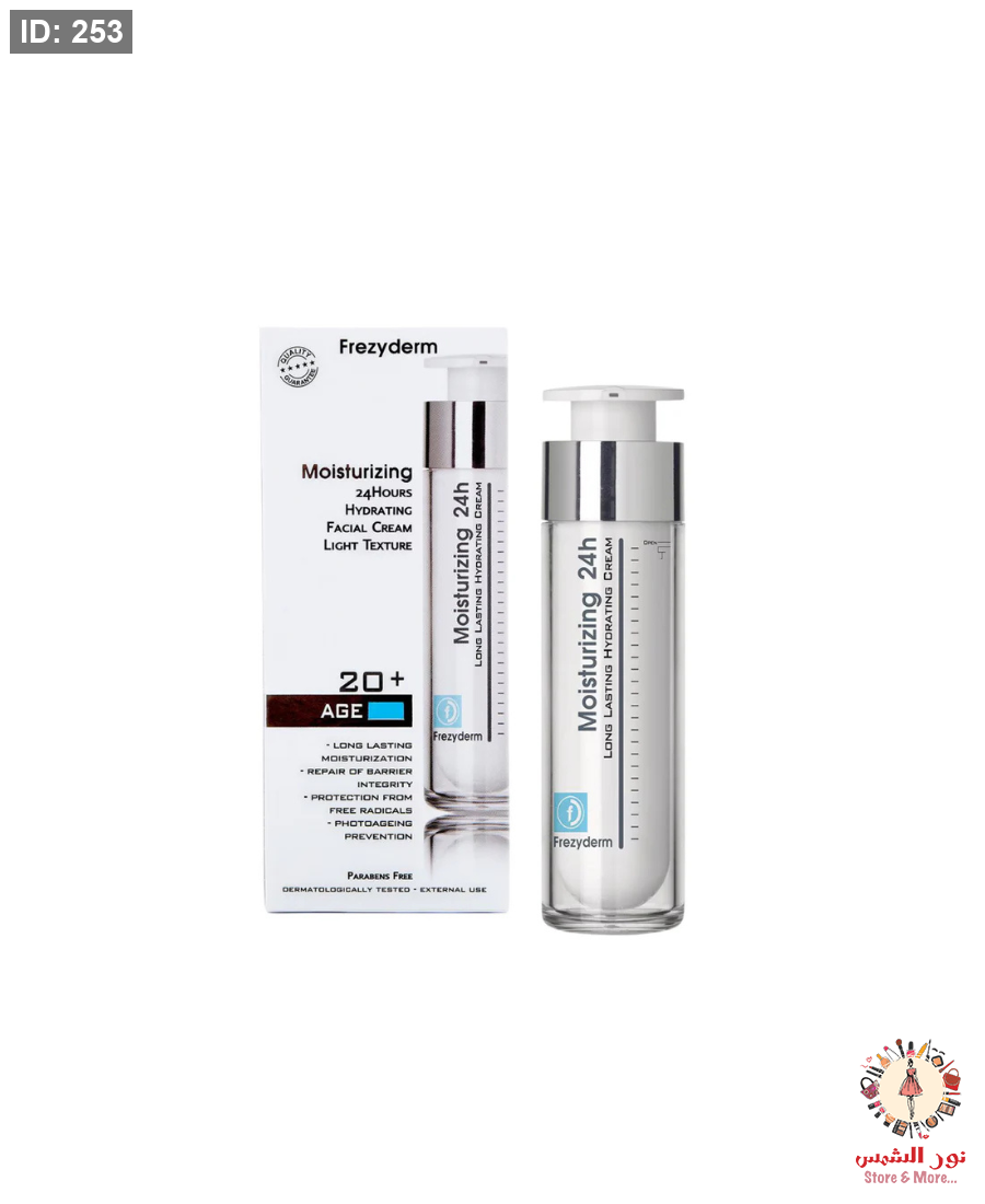 كريم Frezyderm Moisturizing 24h يتميز بتركيبته الخفيفة التي توفر ترطيباً عميقاً وطويلاً للبشرة يصل حتى 24 ساعة. يساعد على إصلاح حاجز البشرة، حمايتها من الجذور الحرة، والوقاية من علامات الشيخوخة المبكرة الناتجة عن العوامل البيئية. مناسب للبشرة الشابة +20 وجميع أنواع البشرة، بملمس خفيف يمتص بسرعة دون ترك أثر دهني.