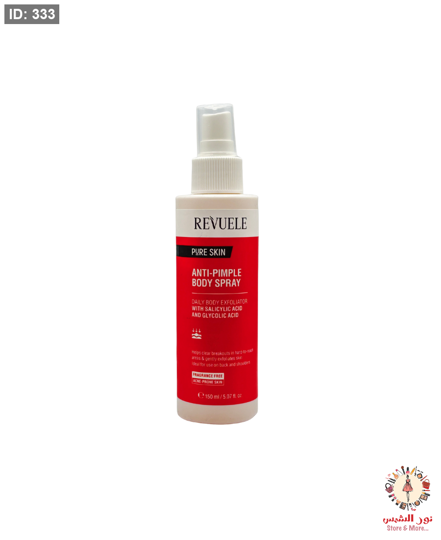 رذاذ الجسم المضاد للحبوب من Revuele هو الحل العملي والمثالي لعلاج مشاكل الحبوب في مناطق الظهر والكتفين والجسم. يحتوي على حمض الساليسيليك و حمض الجليكوليك اللذين يعملان على تقشير البشرة بلطف، تنقية المسام ومنع انسدادها، مما يساعد في تقليل وتهدئة الحبوب. بفضل تركيبته الخفيفة الخالية من العطور، يمتص بسرعة ويمنح البشرة مظهرًا نقيًا وصحيًا. مناسب للاستخدام اليومي وللبشرة المعرضة لحب الشباب.